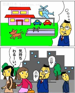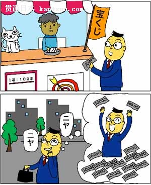 一、课程计划 地点:マリのアパート 场景:宝くじ 掌握词条:にやにや 二、では、始まりますよう! 下面,请大家看一下本期的图片,注意图片中出现的拟声词和拟态词哦。最好认真地把词汇分分类,哪些是已经掌握的,哪些是含糊不清的,哪些是根本不会的,一会学习起来就可以有的放矢啦,O(∩_∩)O哈哈~