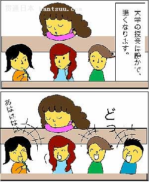 一、课程计划 地点:大学(だいがく) 场景:何で笑ったの。 掌握词条:どっと 二、では、始まりますよう! 下面,请大家看一下本期的图片,注意图片中出现的拟声词和拟态词哦。最好认真地把词汇分分类,哪些是已经掌握的,哪些是含糊不清的,哪些是根本不会的,一会学习起来就可以有的放矢啦,O(∩_∩)O哈哈~