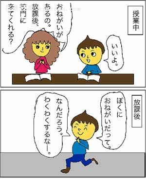 一、课程计划 地点:大学(だいがく) 场景:ラブレター。 掌握词条: 二、では、始まりますよう! 下面,请大家看一下本期的图片,注意图片中出现的拟声词和拟态词哦。最好认真地把词汇分分类,哪些是已经掌握的,哪些是含糊不清的,哪些是根本不会的,一会学习起来就可以有的放矢啦,O(∩_∩)O哈哈~