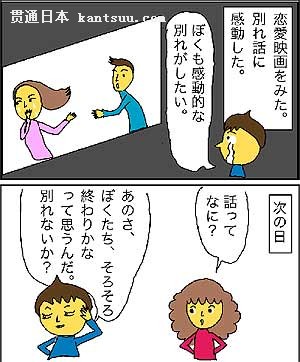 一、课程计划 地点:映画館(えいがかん) 场景:別れ話。 掌握词条:あっさり 二、では、始まりますよう! 下面,请大家看一下本期的图片,注意图片中出现的拟声词和拟态词哦。最好认真地把词汇分分类,哪些是已经掌握的,哪些是含糊不清的,哪些是根本不会的,一会学习起来就可以有的放矢啦,O(∩_∩)O哈哈~