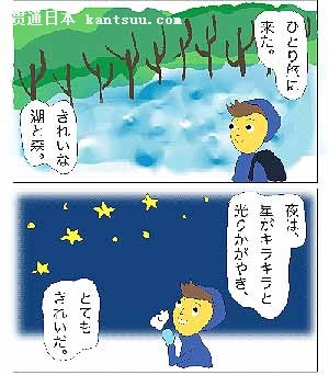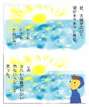 一、课程计划 地点: 湖(みずうみ) 场景: 一人旅。 掌握词条: きらきら 二、では、始まりますよう! 下面,请大家看一下本期的图片,注意图片中出现的拟声词和拟态词哦。最好认真地把词汇分分类,哪些是已经掌握的,哪些是含糊不清的,哪些是根本不会的,一会学习起来就可以有的放矢啦,O(∩_∩)O哈哈~