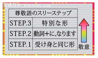 这三种形式在表达尊敬的程度上是有所不同的,如下图所示,第1种形式(被动形式)是最低一级的尊敬语,而第3种形式(特殊形式)则是最高一级的尊敬语。