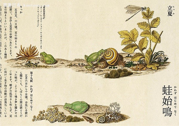 5月5日到9日前后。蛰伏了一整个冬天,从冬眠中醒来的雄蛙开始呼叫身边的雌蛙。虽说节气显示立夏,但在日本,没有经历过梅雨季节是算不上真正的夏天的。立夏正好处在日本黄金周期间,加之这时候气候宜人,相信许多家庭会选择出游吧。 关于青蛙,日本有许多知名的俳句。比如 “痩蛙負けるな一茶是にあり”,是54岁的日本俳句大师小林一茶为病重的儿子千太郎所做。可惜儿子还是早早夭折,这句话也散发着悲伤的味道。还有一句来自松尾芭蕉“古池や蛙飛びこむ水の音”—— 蛙跃古池寂,静潴传清声。动与静、寂与响在时间之外完成了几度转递,这种忘我之境就是芭蕉的“闲寂”与“风雅”。 |